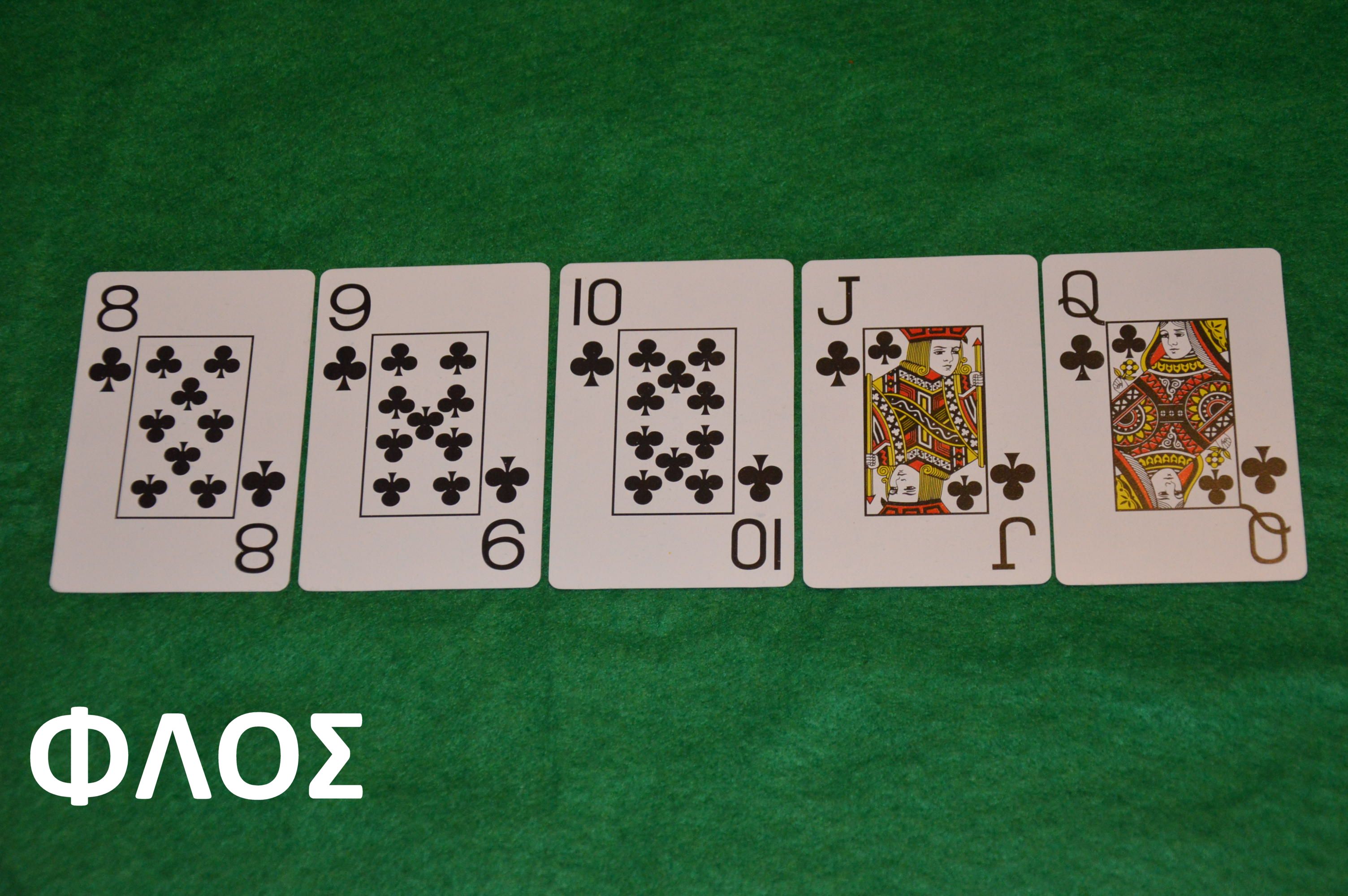 2. ΦΛΟΣ ή ΚΕΝΤΑ ΦΛΟΣ. Πέντε φύλλα με αύξουσα σειρά με ίδιο σχήμα. Αν έχουμε Άσσο στο ιδιο σχήμα μπορούμε να κάνουμε ΦΛΟΣ με τον Άσσο σαν μίκρότερο φύλλο.