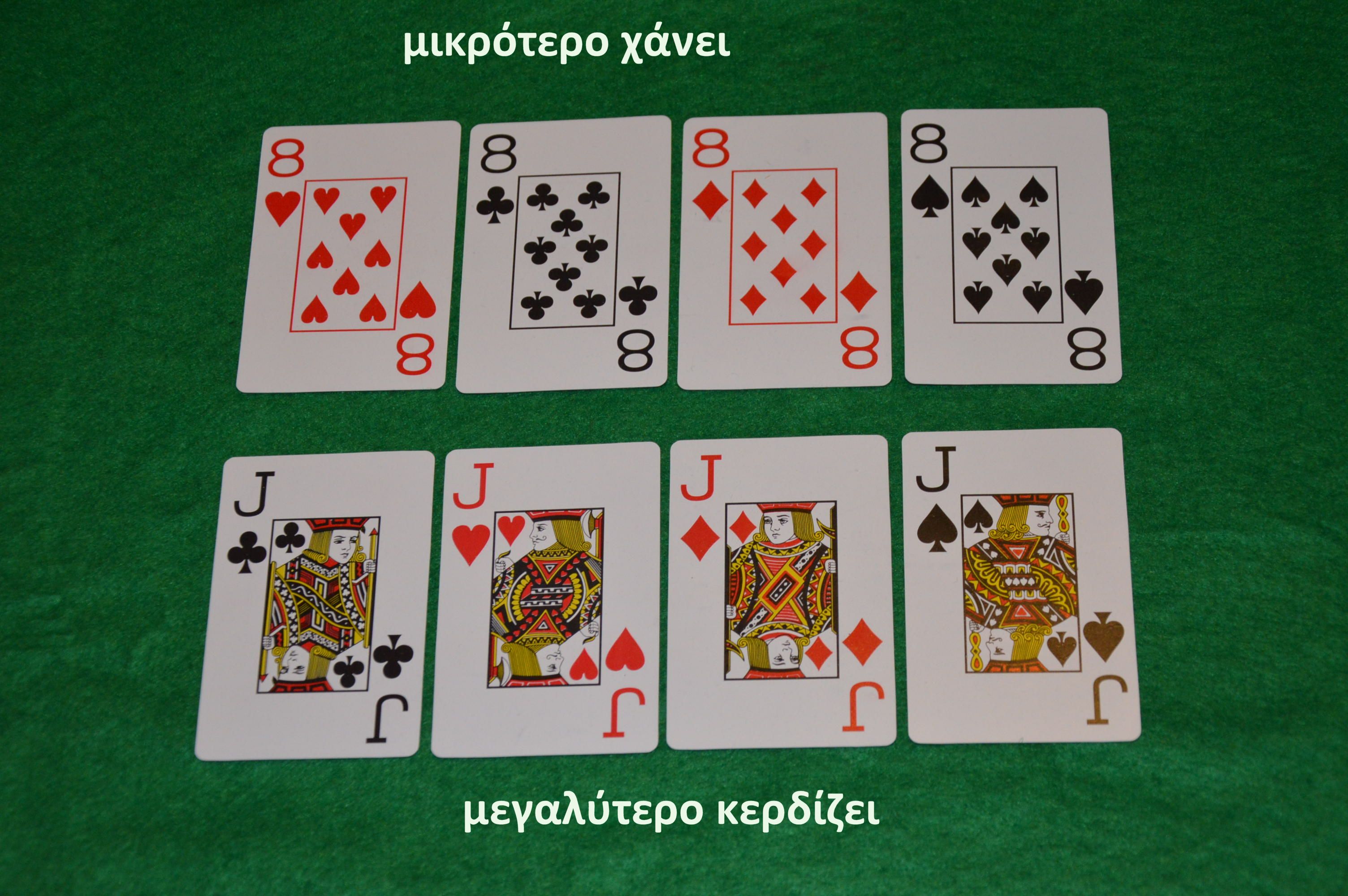 3. Αν δύο ή περισσότεροι παίχτες έχουν ΚΑΡΕ τότε κερδίζει το μεγαλύτερο φύλλο. Στο παράδειγμα το καρέ του βαλέ κερδίζει το καρέ του οχτώ.