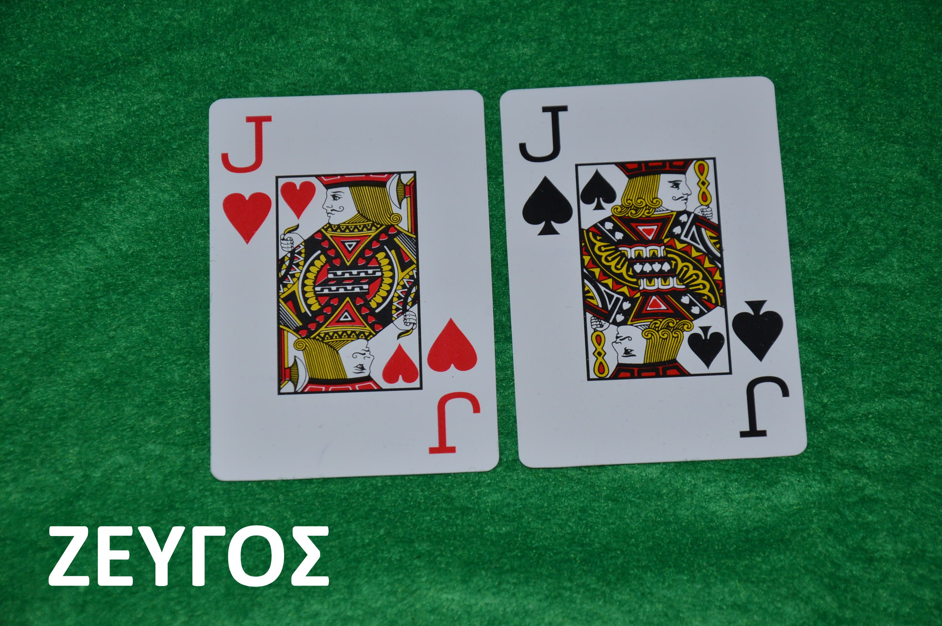 9. Αν δύο παίχτες έχουν ΖΕΥΓΟΙ τότε κερδίζει το μεγαλύτερο ζευγάρι. Αν τα ζευγάρια είναι ίδια τότε κερδίζει ο παίχτης που στο χέρι έχει το μεγαλύτερο φύλλο. Αν και στο χέρι έχουν το ιδιο φύλλο μοιράζονται το ποτ. Όπως ακριβώς και στο προηγούμενο. Στο πρώτο παράδειγμα οι βαλέδες κερδίζουν τα εξάρια και στο δεύτερο αφού οι πάιχτες έχουν ίδια ζευγάρια, βαλέδες, κερδίζει ο παίχτης που στο χέρι του έχει ρήγα.